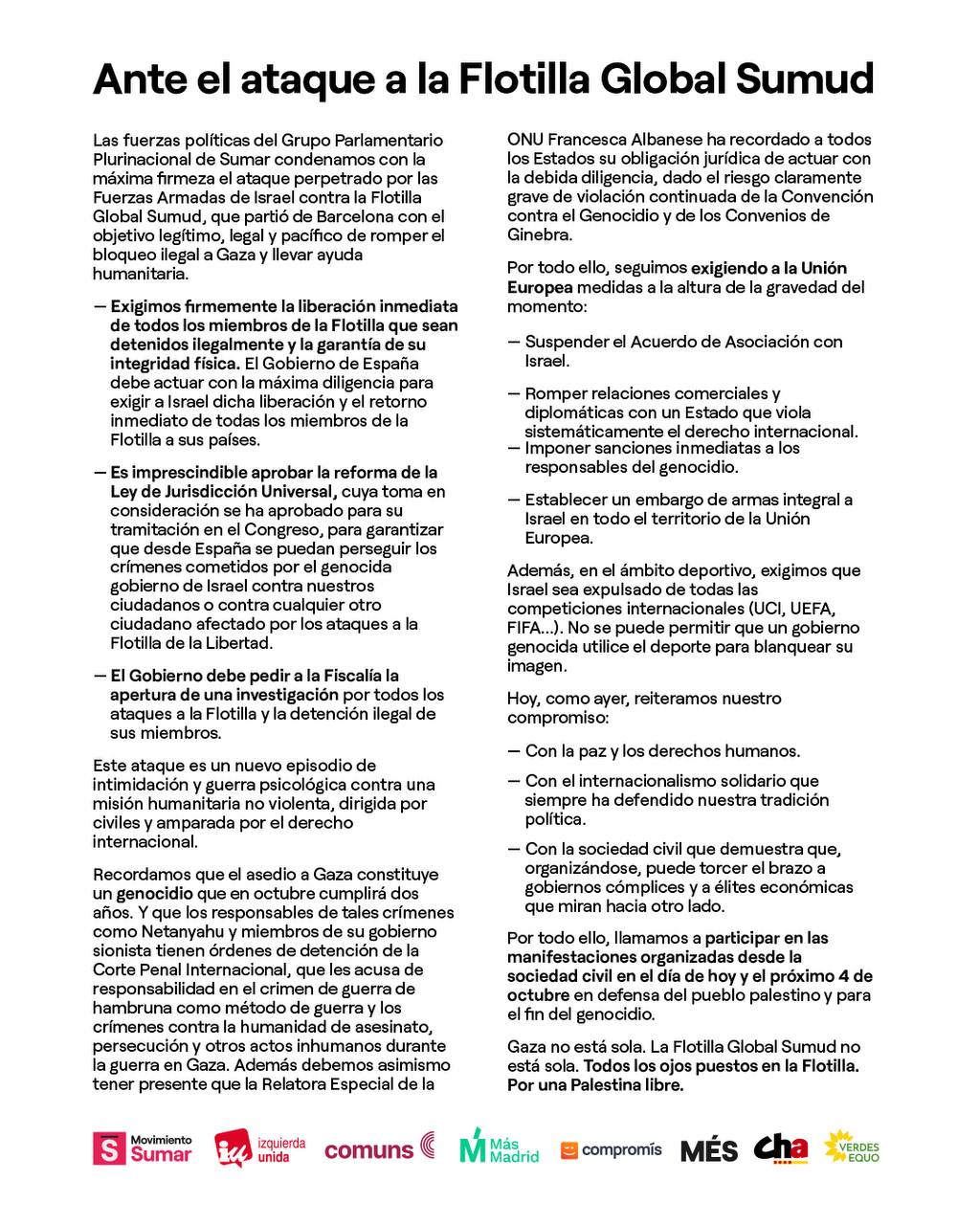 Por todo ello, llamamos a participar en todas las manifestaciones organizadas así como el próximo 4 de octubre. Todos los ojos puestos en la Flotilla. Por una Palestina libre.